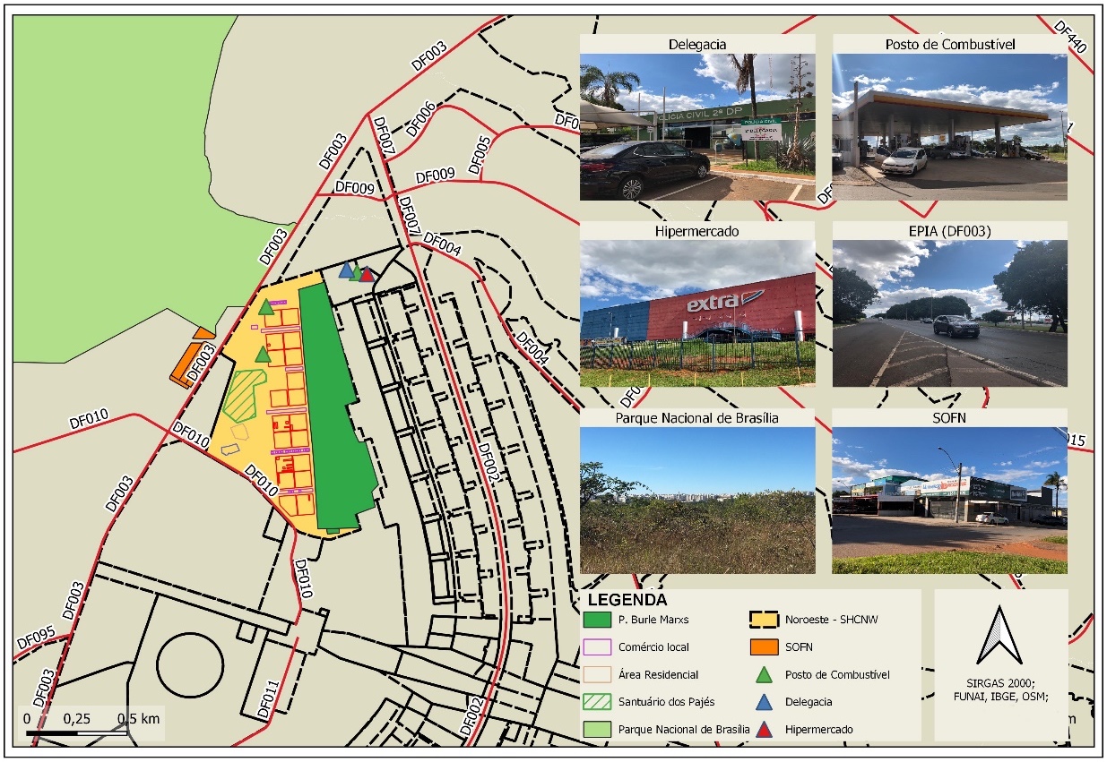 Na saída da EPIA, em direção à via de acesso ao bairro Noroeste, mais infraestruturas de prestação de serviços que remetem, de um lado, à transnacionalização do território, tendo em vista a presença de quatro concessionárias de veículos automotivos, redes de shopping center, atacadões e hipermercados e uma rede de petshop, além de postos de gasolina; e de outro lado, a presença do Estado no ordenamento do território, materializada pela 2ª Delegacia de Polícia Civil e pelo Grupamento de Proteção Ambiental do Corpo de Bombeiros Militar do Distrito Federal [CBMDF].