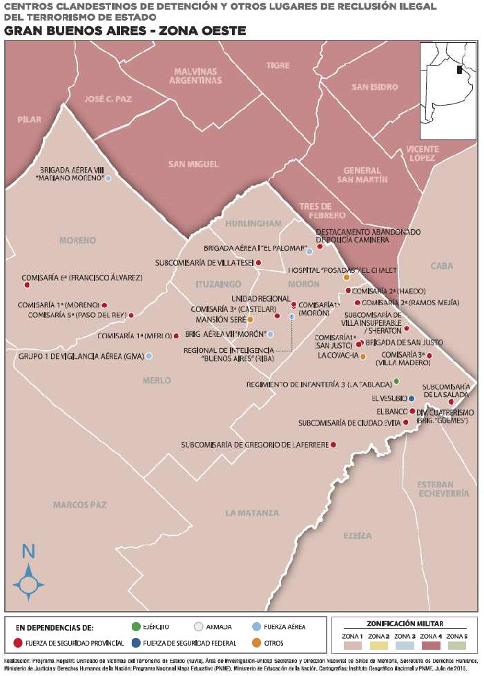 El programa institucional tendiente a la constitución de un lugar de memoria en el ex centro clandestino de detención conocido como “Atila”, que actualmente lleva el nombre de Espacio Mansión Seré (EMS) definió una serie de actividades que intervinieron en la configuración de los procesos socio-espaciales en el Predio Quinta Seré a partir de las relaciones entre las instituciones que allí se encuentran: el Espacio Mansión Seré (el lugar de la memoria y Centro de Interpretación de la Historia Reciente), La Casa de la Memoria y la Vida (Dirección de Derechos Humanos Municipal) y la Dirección de Deportes Municipal (institución que organiza y gestiona las actividades del Polideportivo Municipal Gorki Grana). El programa memorial estuvo centrado en realizar un trabajo de recuperación arqueológica de los cimientos de la Mansión Seré o “Atila” que funcionó como Centro Clandestino de Detención entre los años 1977 y 1978 y formó parte del Circuito Represivo de la zona Oeste de la Provincia de Buenos Aires, la denominada sub-zona 16 integrada por el Partido de Morón, Merlo y Moreno (fig. 1).