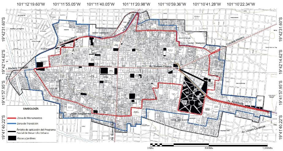 Ante el detrimento del centro histórico de Morelia, se buscó su incorporación en la Lista del Patrimonio Mundial como una alternativa para su adecuada conservación. Un paso previo fue la promulgación de un decreto federal que declaró una zona de monumentos históricos en 1990 (fig. 7), la cual protegió 219 manzanas; 1,113 monumentos históricos; así como 14 plazas, jardines y fuentes (Diario Oficial de la Federación, 1990, diciembre 19).
