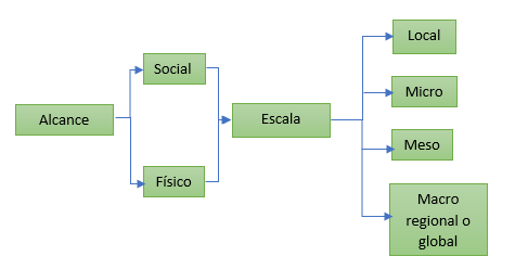 Considerando lo anteriormente expuesto, se ha visto la relevancia que guardan las relaciones existentes entre diferentes lugares, así como los diversos fenómenos y las características que surgen como resultado de tales interacciones. La capacidad de medir a qué escala (o escalas) opera estos procesos hacen necesario hablar del alcance. Para Garrocho (2003) este concepto es la máxima distancia que los consumidores están dispuestos a trasladarse para poder obtener un servicio o un bien. aunque también puede significar el límite del área de cualquier tipo de mercado, y la escala en la que se examina algún fenómeno en el espacio y hasta dónde llegan sus implicaciones, este fenómeno puede ser de orden social o físico y abarcar escalas: local, micro, meso, macro o global (Figura 2).