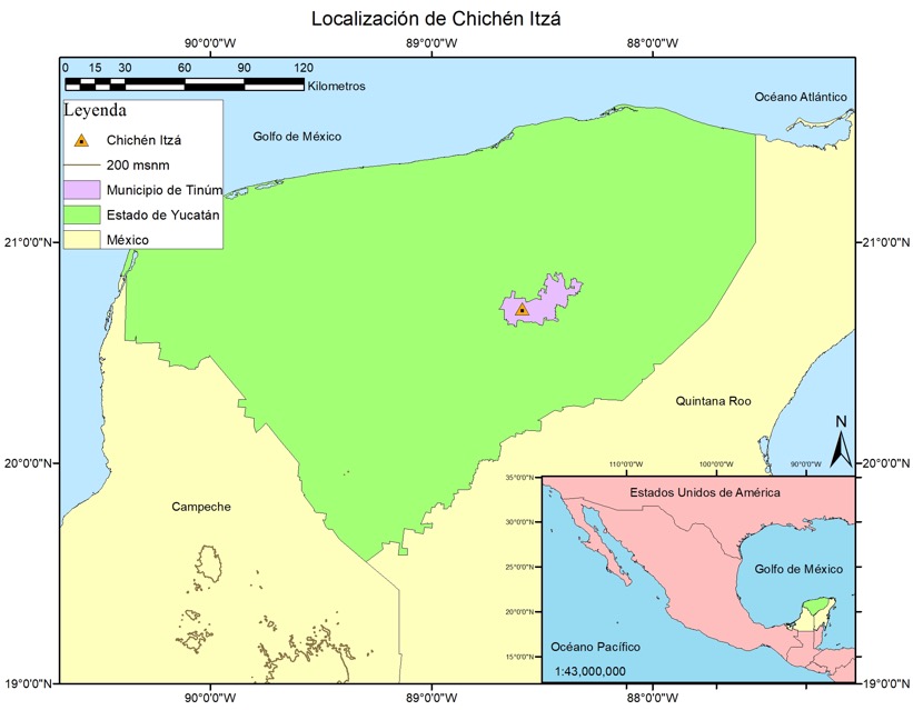 Chichén Itzá se localiza en el municipio de Tinum, en el estado de Yucatán, al sureste de México (ver figura 3, abajo), con un relieve casi llano en su totalidad, salvo un ligero desprendimiento montañoso que no excede los 300 metros de altura, denominado Sierrita de Ticul (SEDUMA, 2012). Chichén Itzá significa en lengua maya “al borde del pozo de los itzaes”, haciendo referencia al Cenote Sagrado, un cuerpo de agua ubicado en el interior de la zona.