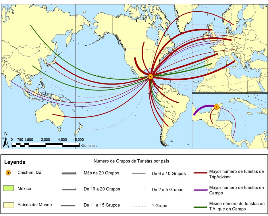 Después de filtrar la información, el uso de ambas herramientas metodológicas permitió conformar una matriz total de 350 turistas para las variables de interés de este estudio: país de origen y ciudad de los turistas, opiniones, otras referencias turísticas y geográficas, formas de transporte, experiencias, entre otras, con la finalidad de hacer un análisis más completo y así determinar el alcance del turismo arqueológico en Chichén Itzá. Esto, a su vez, permitió realizar cartografía temática acerca de los flujos de visitantes y los rasgos de centralidad del sitio según los postulados teóricos utilizados.