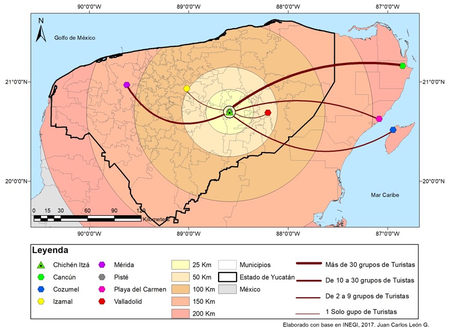 Cabe destacar que se encontró que el área de influencia de Chichén Itzá como sitio de turismo arqueológico abarca prácticamente todas las ciudades turísticas de la península de Yucatán, lo que incluye Cancún, Mérida, Cozumel, Izamal y Playa del Carmen; lo que se apoya en el hecho de que, de los turistas encuestados, la gran mayoría se hospedara en alguno de estos sitios.