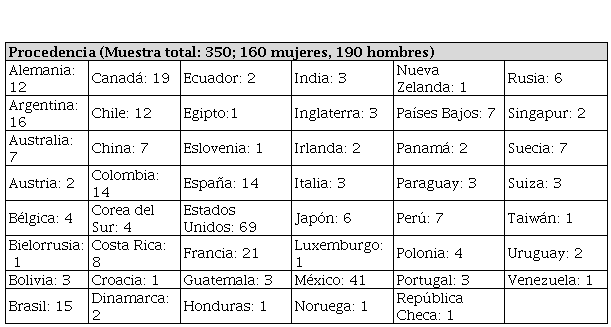 Además de la gran variedad de países representados en la muestra total, también es posible observar el predominio de los turistas estadounidenses, producto de la colindancia geográfica, y seguido (aunque con una diferencia muy grande) por la canadiense, explicada también por criterios de proximidad. No obstante, es de reconocer también la gran participación de países europeos (21 nacionalidades diferentes registradas) y la casi nula recepción de turistas de origen africano (un egipcio en 350 turistas). En síntesis, desde la perspectiva regional, Europa predomina en esta muestra con el 28.28%, seguido por América Latina (excepto México) con el 25.71%, Norteamérica (Estados Unidos y Canadá) con el 25.14%, Asia con el 6.58%, Oceanía con el 2.29% y África con el 0.29%. Con estas informaciones se construyó un mapa síntesis (figura 5).