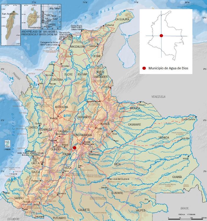 El antiguo lazareto de Agua de Dios es actualmente un municipio colombiano cuyo casco urbano está situado a 124 km al suroccidente de Bogotá D. C., en la zona central del país. Cuenta con una población aproximada de 10.750 habitantes y está ubicado en el valle de la cuenca media del río Magdalena con una temperatura promedio de 26°C. Las condiciones de ubicación con respecto a Colombia se pueden observar en la figura 1.