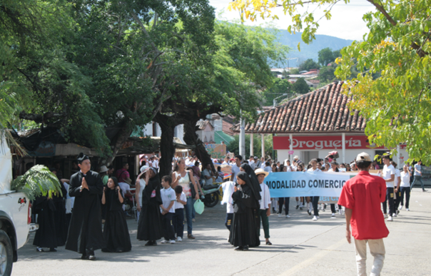 Estas dos tramas, recambios generacionales y movimientos poblacionales, generan una distancia con estos relatos fundantes relacionados con la agencia de la lepra, lo que exige un proceso de construcción de memoria más amplio e integrador. En la figura 6 se puede observar una comparsa realizada por los niños y jóvenes de colegios de Agua de Dios, representando los eventos fundantes de la población a propósito de la celebración de los 125 años de presencia de la comunidad salesiana en el territorio. Este tipo de representaciones, en tanto conmemorativas y excepcionales, no están