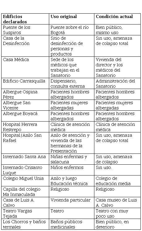 El escueto texto de la mencionada Ley, que no incluyó ningún tipo de considerandos, se centra en la enumeración del listado de edificios y sitios incluidos en la declaratoria (Artículo 1°) que coinciden mayoritariamente con el relato historiográfico del apartado anterior, sin definir una estrategia de fortalecimiento de la memoria como tampoco un plan de conservación de los edificios y sitios incluidos. En la tabla 1 se relaciona el conjunto de edificios declarados y ubicados en Agua de Dios, su función original y su condición actual.
