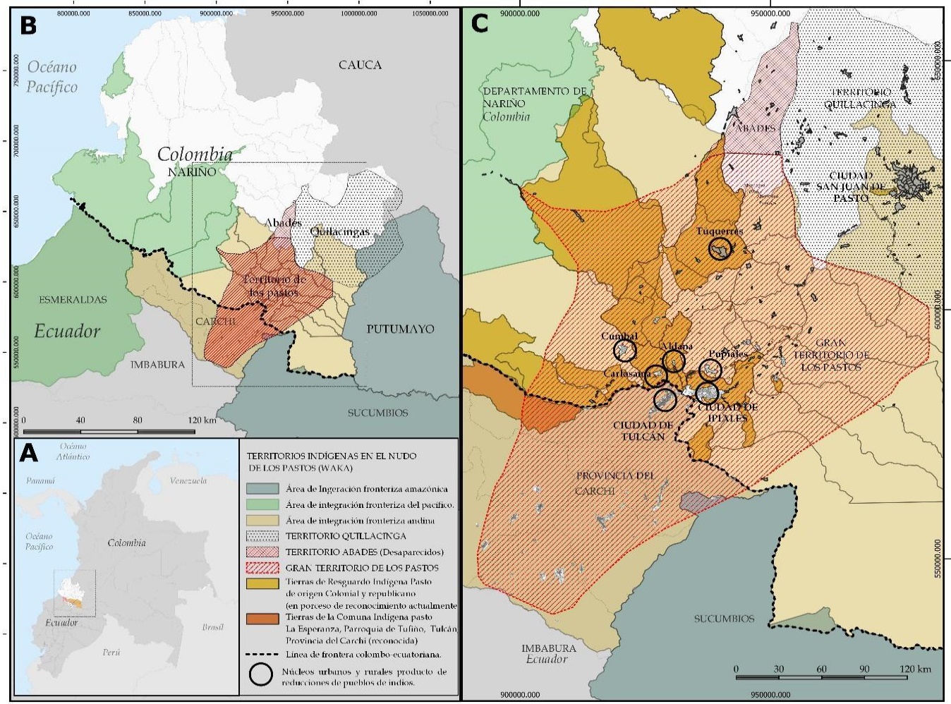 Para aproximarse a la comprensión de este fenómeno urbano-territorial e histórico, es importante revisar las tensiones que se presentan en dos nociones introducidas por Costa & Moncada (2021, p.18) la “segregación originaria” y la “decolonialidad originaria”, que permiten entender aspectos del fenómeno desde la “praxis decolonial” de las comunidades históricamente segregadas como pueblos de indios. Este nuevo encuadre, permite observar aspectos y estrategias decoloniales en el territorio como parte una fuerza transformadora del modelo de poblamiento segregacionista colonial y neocolonial. En este orden de ideas, se introduce en la discusión, la práctica transhistórica de autodeterminarse en el espacio y en el discurso, como un vector de incidencia en las relaciones entre lo urbano – rural en la región fronteriza entre Colombia y Ecuador habitada históricamente por los pueblos indígenas pastos.