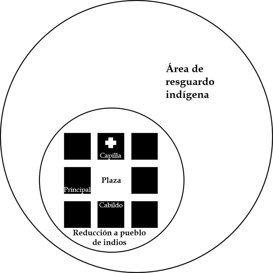 Por su parte, los pueblos de indios en el sur del continente fueron un modelo idealizado para la vida en civilización, “vida en república” y vida urbana moderna, racionalizado bajo la misma lógica administrativa y homogeneizante del espacio conquistado, con el propósito de resguardar, adoctrinar y hacer entrar en una vida “productiva” al “indio” (Herrera, 2014). El modelo se componía de tres elementos espaciales: 1- El asentamiento o núcleo (pueblo), materializado en un trazado reticular similar a la ciudad, con una plaza central y los edificios de los poderes eclesiásticos, cabildo y alcaldía, donde el “indio” debía vivir en sociedad, muchas veces compuesta por familias de diferentes procedencias obligados habitar el mismo espacio. 2- El área de tierras ejidales o de resguardo concedida por la Corona a cada pueblo de indios, o globo de tierra para la producción y el sustento propio y tributario. 3- Los dos anteriores conformaban una división política administrativa de resguardo en medio de las tierras realengas, donde el indígena reducido, podía vivir en sociedad y con cierta autonomía. El modelo así planteado, facilitó la pacificación del “salvaje” y su incorporación a una nueva forma de producción económica (figura 2).