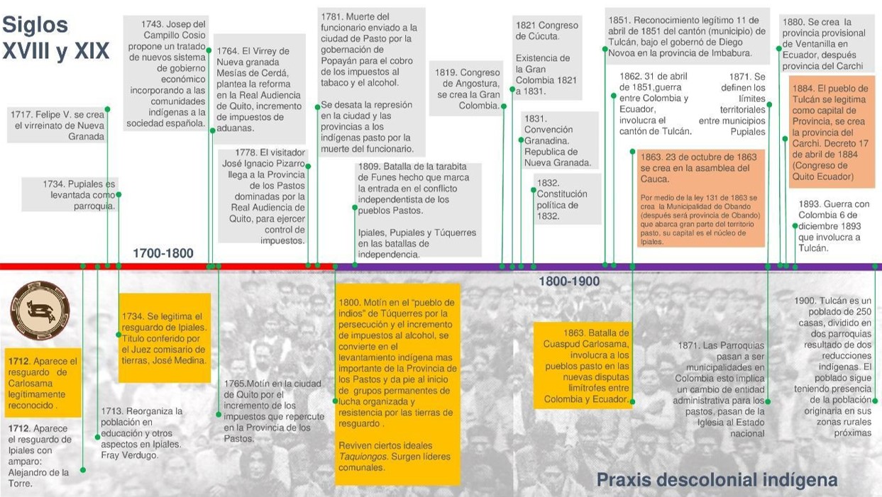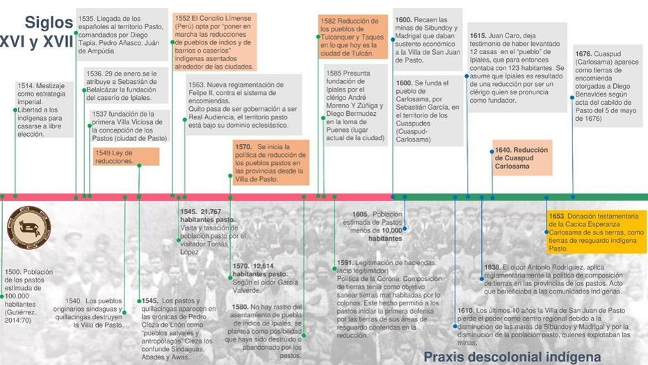 Ahora bien, al ser un vector transhistórico, la autodeterminación permite desvelar el proceso invisibilizado de la praxis decolonial, como un fenómeno presente en el proceso de conformación urbano territorial. En este caso, en el Nudo de los Pastos veremos en un periodo de larga duración (siglos XVI al XIX), y en cinco momentos de inflexión histórica, algunos aspectos generales que permiten entender el ejercicio de la autodeterminación indígena en el espacio urbano-rural de los pastos, que se manifestó en distintos hechos, actos o alianzas políticas concretas de la comunidad, para la defensa de la autonomía del territorio de resguardo, defensa de sus tierras y la lucha jurídica por la titularidad de las mismas, como parte de los múltiples giros adaptativos y tensiones entre la segregación originaria y la praxis decolonial.