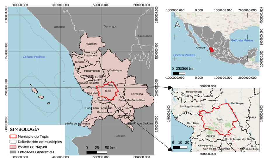 La presente investigación se desarrolló en la cabecera homónima del municipio de Tepic, el cual se localiza en el estado de Nayarit. Su ubicación geográfica se encuentra entre las coordenadas 21º 51' y 21 º 24' latitud norte y entre 104º 34' y 105 º 05' longitud oeste. Tepic colinda en la zona norte con los municipios de Santiago Ixcuintla y El Nayar; al sur con el municipio de Xalisco, al este con El Nayar y con Santa María del Oro, y al oeste con los municipios de San Blas y Santiago Ixcuintla.