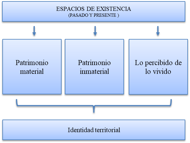 Esta propuesta se compone de los espacios de existencia donde se genera la relacionalidad entre los ciudadanos y sus entornos por las experiencias vívidas desde el pasado hasta el presente. Tal relacionalidad estimula la composición de los patrimonios material e inmaterial y las formas de percibir lo vívido que en conjunto abonan elementos para la coproducción de una identidad territorial con mayor sensibilidad a los rasgos de un territorio donde se entreteje la vida material y subjetiva desde la cotidianidad de las personas (Figura 2).