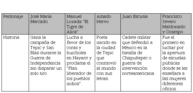 En el caso del presente trabajo, se exploró a partir de la consulta sobre los personajes importantes, la gastronomía, las costumbres y las tradiciones alegóricas de la ciudad. Dentro de los personajes que fueron mencionados como icónicos, Amado Nervo (45.5%) y Juan Escutia (36.76%) consiguieron la mayoría de votos; sin embargo, Manuel Lozada (12.98%), también conocido como el Tigre de Álica, obtuvo una cantidad considerable de votos, por tanto es un personaje a considerar al igual que los dos mencionados anteriormente.