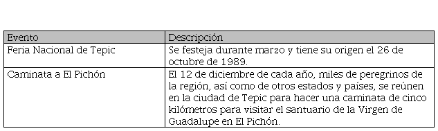 Con relación a las principales costumbres y tradiciones de la capital nayarita, la más mencionada fue asistir a la peregrinación a la comunidad de El Pichón el 12 de diciembre a celebrar el cumpleaños de la aparición de la Santa Patrona del lugar, seguida de la celebración del Día de Muertos en el Panteón Hidalgo, donde suele haber concursos de altares de muertos, decoración de tumbas, cuentacuentos. Cabe resaltar que esta actividad es reciente y se ha venido dando a cabo conforme las tendencias culturales de la ciudad y las aspiraciones de los ciudadanos. Tal como lo expresa Santos (2005) que en un territorio siempre hay nuevos cortes que se agregan a la antigua categoría llamada región como fruto de la nueva construcción del espacio y del nuevo funcionamiento del territorio a partir de lo que es la ciudadanía.