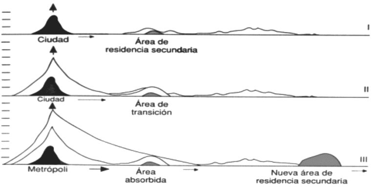 César & Arnaiz (2012) ofrecen un amplio panorama de los grandes procesos de transformación tecnológicos, productivos y de uso impulsados por el turismo en dos comunidades rurales de Argentina a partir de la premisa del cambio de uso del territorio por nuevas actividades en el marco de la multifuncionalidad del mundo rural. En su trabajo establecen los siguientes ejes de cambio, 1) la cercanía de las comunidades a la ciudad de Buenos Aires, 2) Integración de infraestructura, 3) Ampliación por facilidad, 4) Revalorización de la tierra, 5) Reformulación del concepto de periferia. Cuya suma permitió la transformación del territorio a través de la relocalización de las actividades económicas anteriores (agrícolas) y la inserción de nuevas (turismo). Ejes que se ajustan al modelo evolutivo de expansión de la residencia secundaria propuesto por Lundgren (1974), el cual establece cómo en una primera etapa los habitantes de las ciudades establecen su residencia secundaria en los espacios rurales cercanos a la ciudad, aspecto que fortalece las infraestructuras de acceso y comunicación, sin embargo, ese mismo proceso conduce a la expansión de la ciudad y a la absorción e integración de los espacios rurales en ésta, para dar paso a una segunda etapa, donde se retoma la búsqueda de nuevos espacios para establecer segundas residencias en un proceso continuo. (figura 2).
