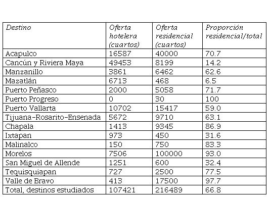 Hiernaux (2010) desarrolló uno de los primeros estudios realizado en México y da cuenta de la existencia e importancia del fenómeno turístico residencial al mostrar la cantidad de espacios de segunda residencia en algunos destinos turísticos del país, en comparación con el número de unidades existentes de uso hotelero (Tabla 1).