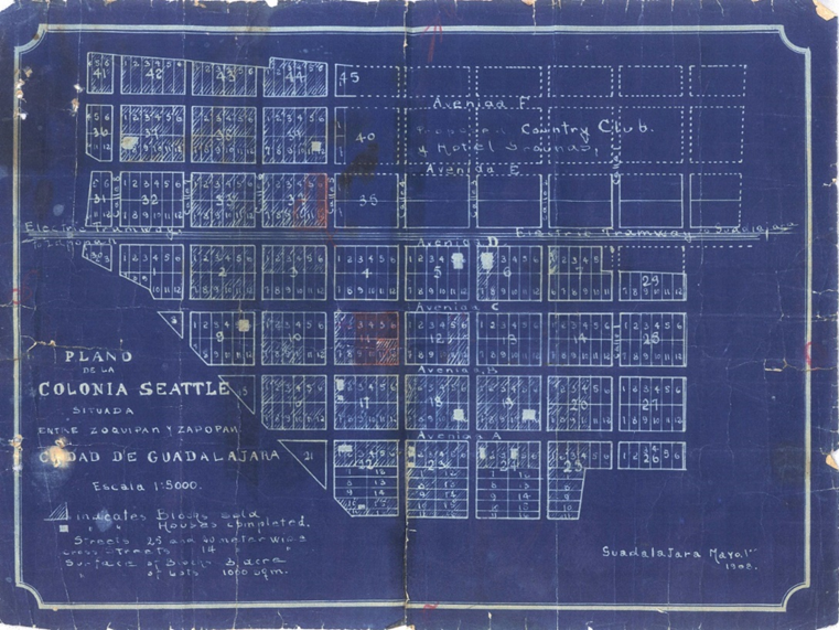 Aunque la anuencia oficial para el establecimiento de la colonia Seattle ocurrió el 14 de agosto de 1908, la idea de construirla inició alrededor de 1902 con la llegada de un grupo de ciudadanos americanos a Zapopan. Entre ellos se encontraban Alfred y Edmond Downs, P. Jacobs y A. W. Parssons, algunos de los cuales ya habían edificado sus viviendas antes de solicitar al gobierno de Jalisco el permiso para la fundación de la colonia (AHJ, 1908b). Así, la Seattle fue el primer asentamiento de tipo residencial en esta entidad y se ubicó en un área cercana a los “pueblos” de Atemajac y Zoquipan, ambos de raigambre indígena (Muriá, 2004, pp. 20-27 y 31-41), y a la villa de Zapopan, sede del antiguo partido del mismo nombre, con jerarquía de ayuntamiento a partir de 1824 —siguiendo lo señalado en la Constitución de Cádiz—, del cual dependían pueblos con menos del millar de habitantes (como Zoquipan), y cabeza de departamento en 1825 (Muriá, 1981, pp. 467-468).