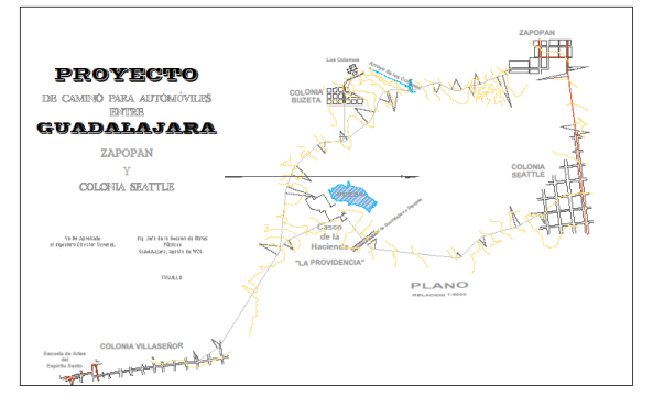 Para la realización de este proyecto se aprovechó la ejecución del camino Guadalajara-Zapopan (realizado entre 1919 y 1920), desviándolo a la altura de la hacienda La Providencia unos cinco kilómetros hacia la colonia Seattle (figura 3). En su financiamiento participaron “los señores Downs, Compañía Industrial de Guadalajara y el señor don Luis Castellanos y Tapia”, dueño de dicha hacienda. Este camino, según afirmaba el periódico El Informador, “se construyó debido al empeño de los Ayuntamientos de esta capital y de la Villa de Zapopan, contando con la ayuda de algunos vecinos de la mencionada villa” (El Informador, 1920, p. 8).