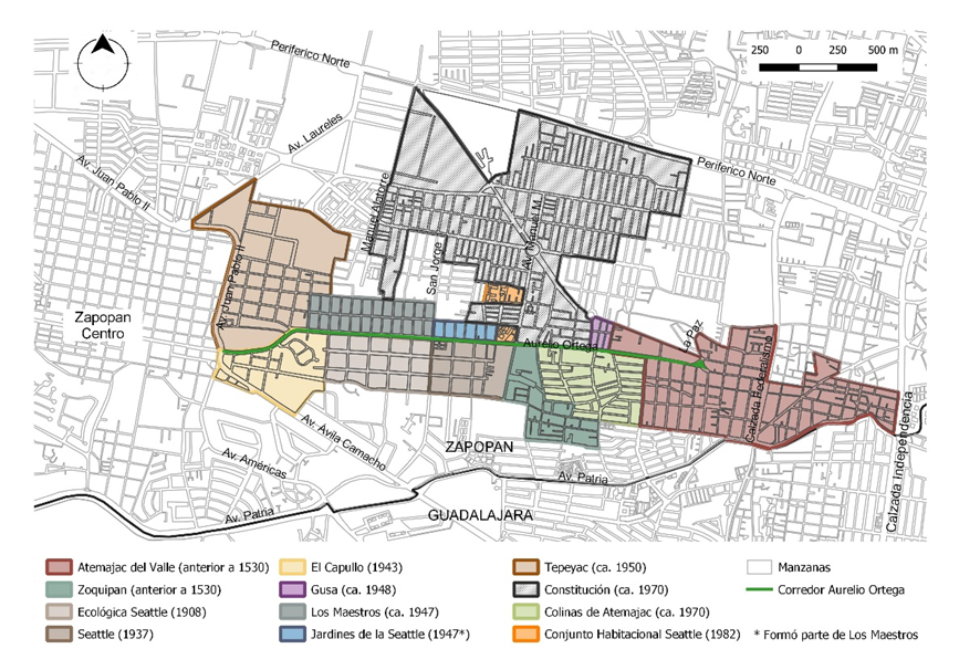 De esta manera, entre 1908 y 1982 se completó la urbanización del área de estudio o unidad general de paisaje articulada por el eje Aurelio Ortega-Atemajac. Durante estos años, igualmente, algunas colonias ajustaron sus áreas y en