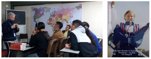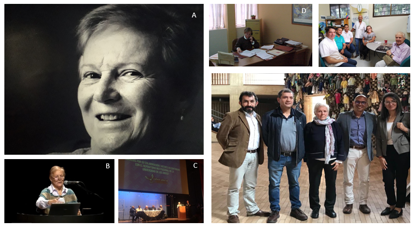 Descripción: A [Foto tomada por Karina Agelvis, en casa de una amiga, 2014]; B [Ponente en la II Conferencia Internacional Rede WATERLAT, São Paulo, Brasil, octubre, 2010]; C [Oradora de orden durante el reconocimiento a los editores de las publicaciones periódicas de la Universidad de Los Andes, Mérida, mayo, 2019]; D [Coordinación del Programa de Maestría en Ordenación del Territorio y Ambiente, 2000]; E [Estancia en el Departamento de Geografía y Medio Ambiente, Universidad de Córdoba, Colombia, marzo, 2020 (prepandemia)]; F [Con los colegas y amigos Gloria Yulier Cadena, Everaldo Batista da Costa, Jhon Montoya y Willington Siabato, Departamento de Geografía, Universidad Nacional de Colombia, Bogotá, octubre, 2022]; G [Charla introductoria a los nuevos alumnos de la Escuela de Geografía, Universidad de Los Andes, Mérida, febrero, 2022]; H [Participación con el equipo de natación de la ULA. Juegos Universitarios organizados por la Federación de Asociaciones de Profesores de Venezuela, julio 1998].