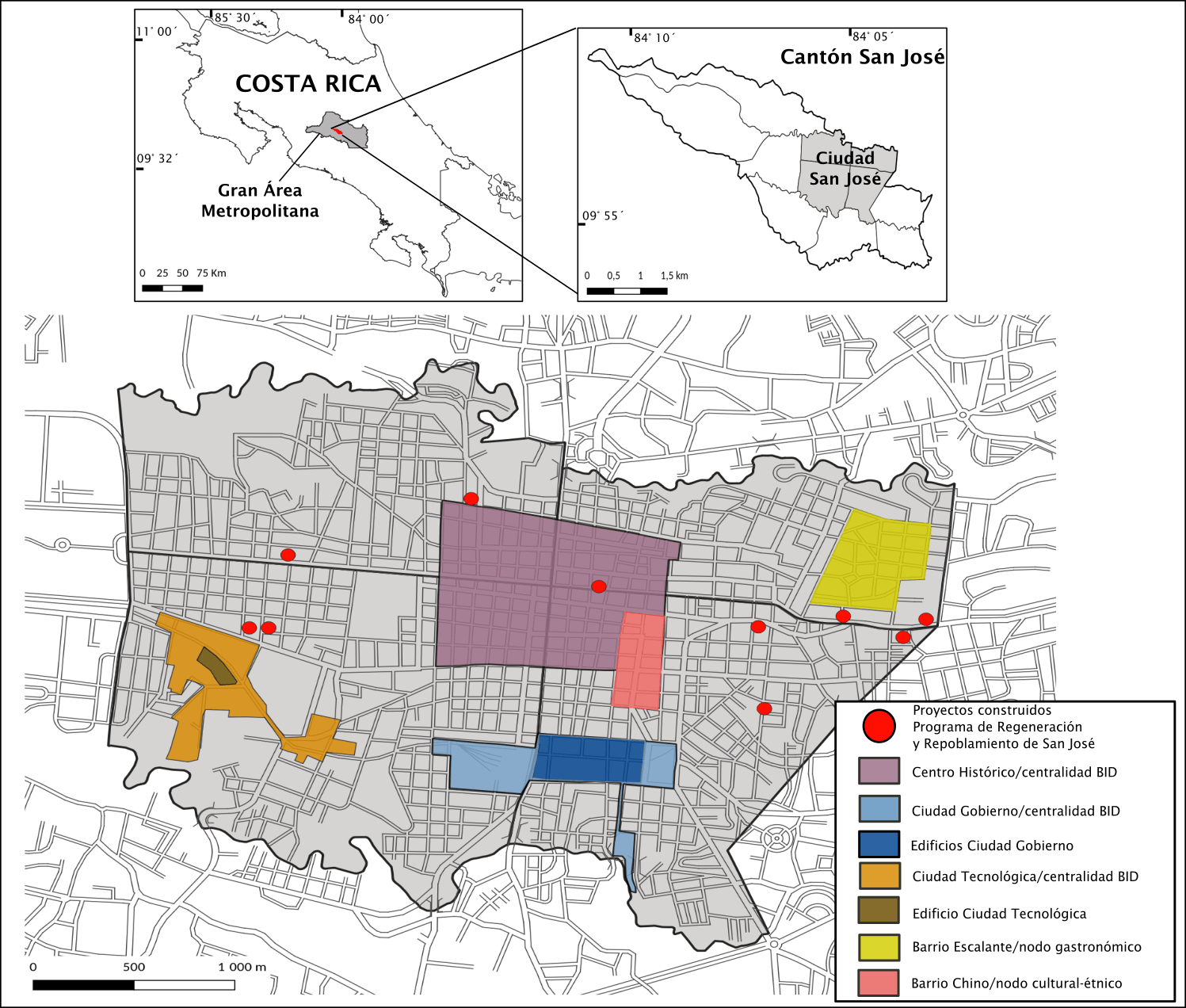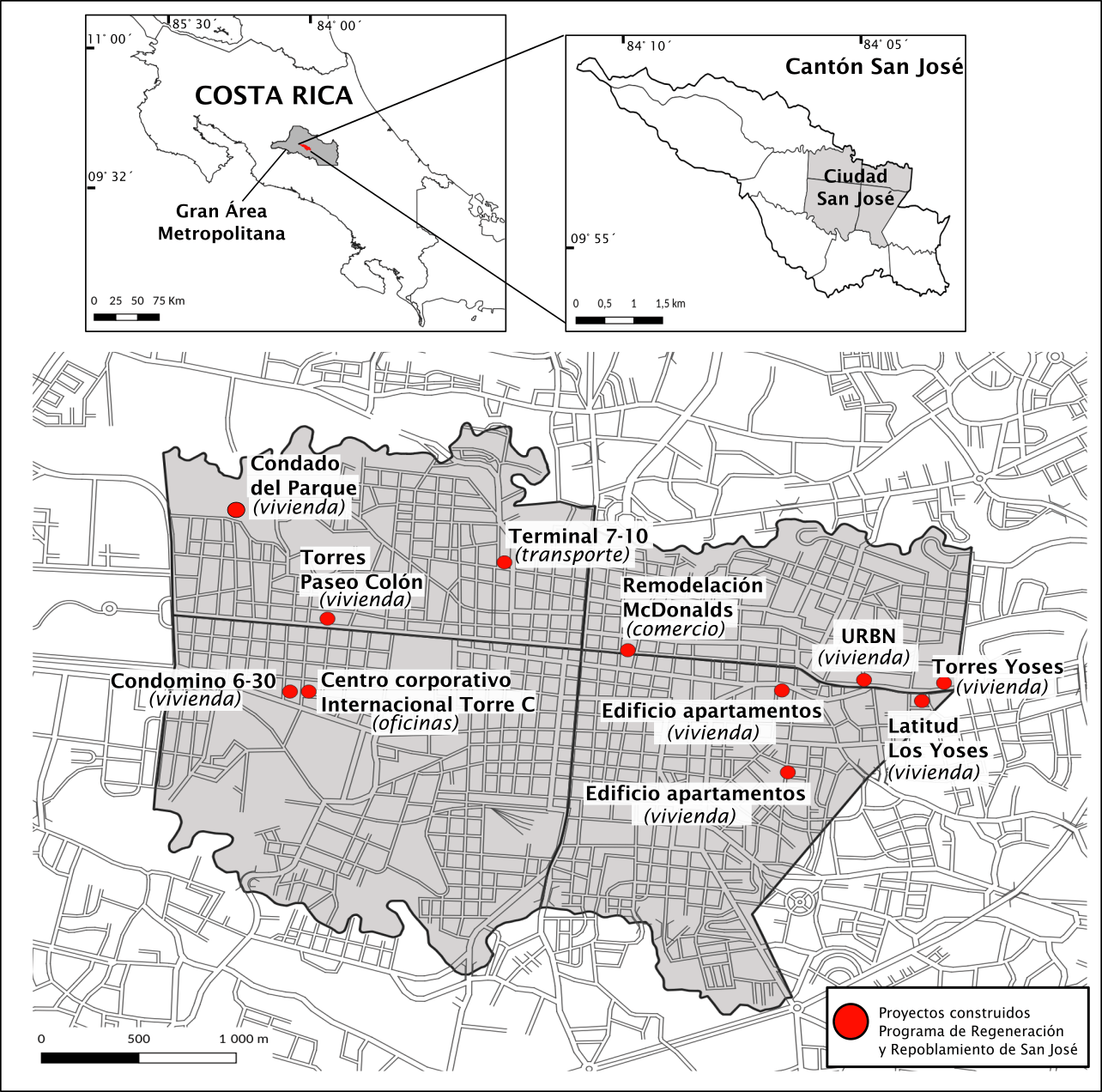 A raíz de lo anterior, en este artículo se plantea el objetivo de analizar los modos de complementariedad entre proyectos diseñados e impulsados por actores locales y transnacionales en la intervención de áreas urbanas centrales. Asimismo, se discute cómo esta complementariedad contribuye a una materialización de un urbanismo neoliberal. Para ello, se seleccionó como caso de estudio a la ciudad de San José, capital de Costa Rica; y las acciones ejecutadas por el Banco Interamericano de Desarrollo (BID), específicamente, en su Iniciativa de Ciudades Emergentes y Sostenibles (ICES) en esta misma ciudad. Este estudio de caso permitirá indagar en las formas cómo se interrelacionan y se complementan proyectos con el fin de provocar transformaciones urbanas dirigidas hacia una competitividad económica. Además, se estarán dando insumos para comprender las implicaciones territoriales que tiene este accionar, lo cual permitirá interpretar o poner el diálogo con lo ocurrido en otras realidades urbanas en Latinoamérica.