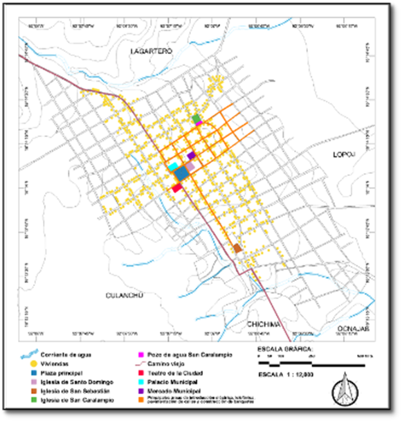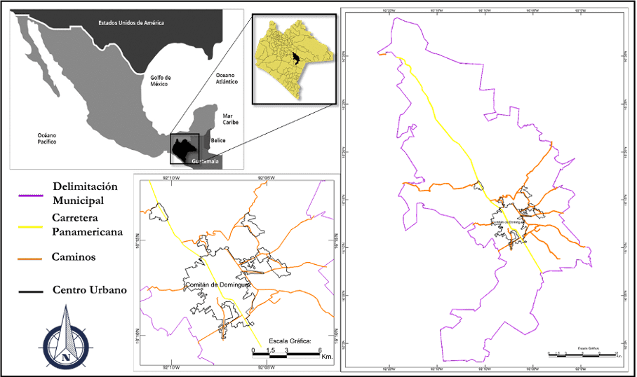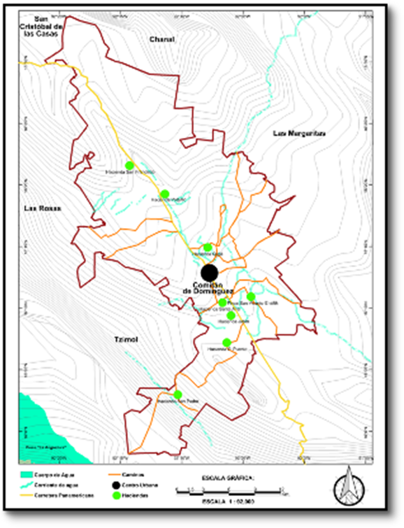 Como complemento a la escala intermedia y microescala que plantea Díaz Terreno (2017), se retoma las variables de análisis para la lectura del espacio urbano planteados por el equipo coordinado por Carlos Chanfón Olmos (2001), esto con el objetivo de no sólo observar la configuración del espacio a un nivel espacial, sino también a un nivel social, cultural, político y económico, considerando el concepto de espacio desde la visión que ofrece Milton Santos (2009) como una instancia de la sociedad, es decir, el espacio que contiene y es contenido por las demás instancias económicas, político- institucionales, culturales e ideológicas. Dichas variables se refieren a lo que definen como la estructura y la morfología de los asentamientos humanos, resultado de la dialéctica entre varios elementos estructurales como: el medio natural (ubicación del asentamiento), el medio artificial (estructura de la traza, arquitectura, infraestructura y equipamiento), el medio socio-cultural (identidad de lenguaje, costumbres y tradiciones), el medio económico ( predominio de tipo de actividades) y el medio político-administrativo (tipo y nivel de jerarquía gubernamental), que para el caso de Comitán contribuyeron a entender la influencia de los hacendados en la población y en sus formas de vida entendiendo a partir de ello como se reflejan en la actualidad junto con el territorio.