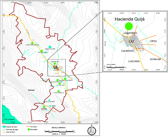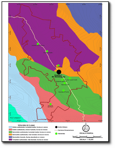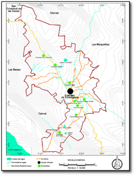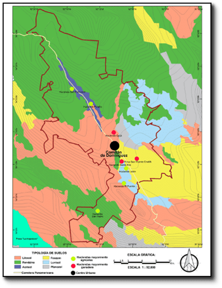No obstante, a partir de la metodología planteada se pudo establecer que a un nivel de macroescala como lo denomina Díaz Terreno, el territorio de Comitán poseía las características óptimas para el desarrollo de las haciendas comitecas, desde su ubicación geográfica, la diferencia de latitudes que tiene la región de norte a sur (CEIEG, s.f.), los tipos de suelos mayormente litosos y rendzinas adecuadas para el cultivo agrícola y la crianza ganadera favoreciendo la compra y venta de producción (figura 4), los climas templados y semicálidos (figura 5), así como la distribución hidrológica de la región, además de contar con importantes cuerpos de agua como los son Juznajab, Chucumaltik y Coila los cuales sirvieron como centros de abastecimiento para las haciendas (Gobierno Municipal de Comitán, 2017) (figura 6).