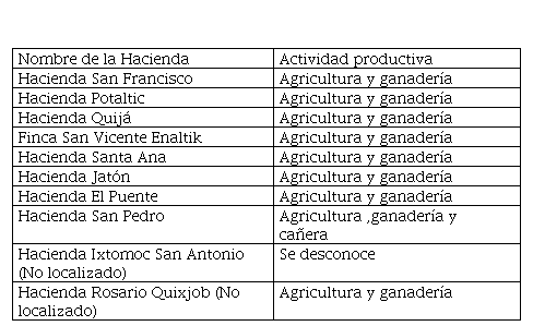 Por tanto, se reconoce que en las principales ciudades del estado de Chiapas una de las conexiones más evidentes fue la relación comercial activa de la ciudad con su entorno productivo, pues la producción que generaban las haciendas servían para proveer a los habitantes de estos centros de población, provocando que estas dos partes se complementaran y se necesitaran mutuamente, lo que para el caso de Comitán no fue la excepción (Veneces et al., 2009). En la región comiteca se identifican diez haciendas a partir de la información que ofrece Pulido Solís (2000), sin embargo, para este estudio se analizan ocho debido al desconocimiento de la ubicación exacta de dos de ellas, las cuales se pueden observar en la siguiente tabla (tabla 1).