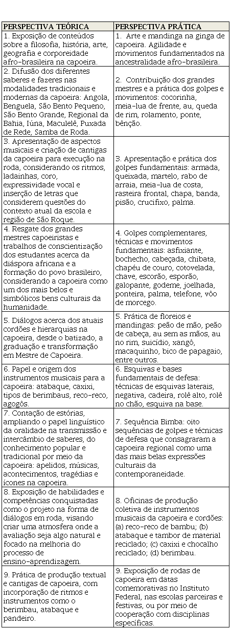 Guiado por este caminho, o público-alvo do projeto fora constituído pela juventude periférica demandante, com apoio das escolas municipais e dos pais, situados nas áreas adjacentes do IFSP, que iniciaram ativa participação no planejamento e gestão das ações, junto a estudantes egressos e regulares que já participavam anteriormente. As atividades propostas constituíram-se em encontros semanais nas escolas, coordenados pela equipe executora, em conjunto com o mestre de capoeira (figura 2), com uma breve síntese na tabela 01 das atividades téoricas e práticas desenvolvidas anualmente.