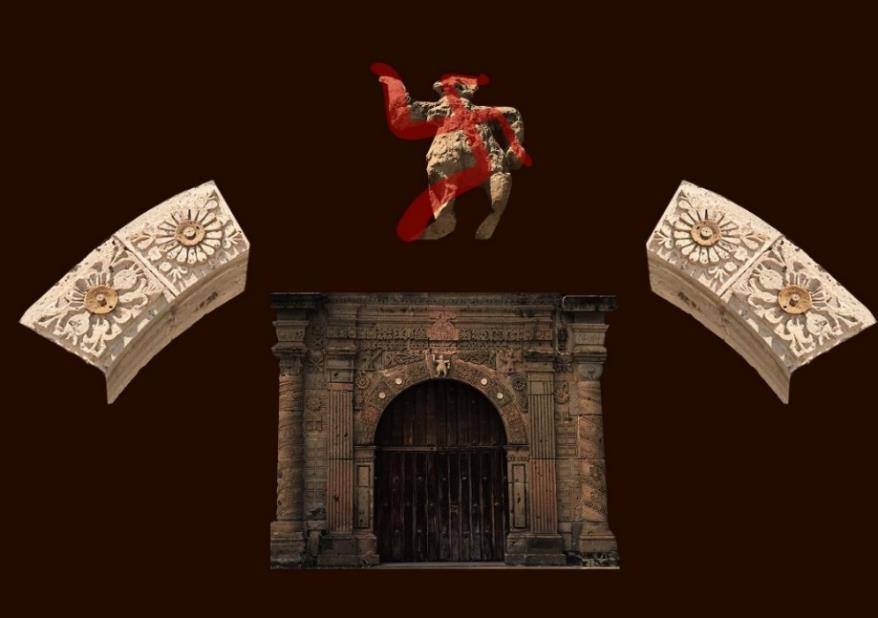 Se sugiere que los cuatro círculos concéntricos en las dovelas laterales del arco de medio punto, junto al entablamento y la Corona Real, simbolizan el Quinto Sol. Estos círculos, al conjugar su diseño con el ángel situado en la clave (dovela central), reproducen aparentemente el signo "nahui ollin" o "cuatro movimientos" (figura 11).