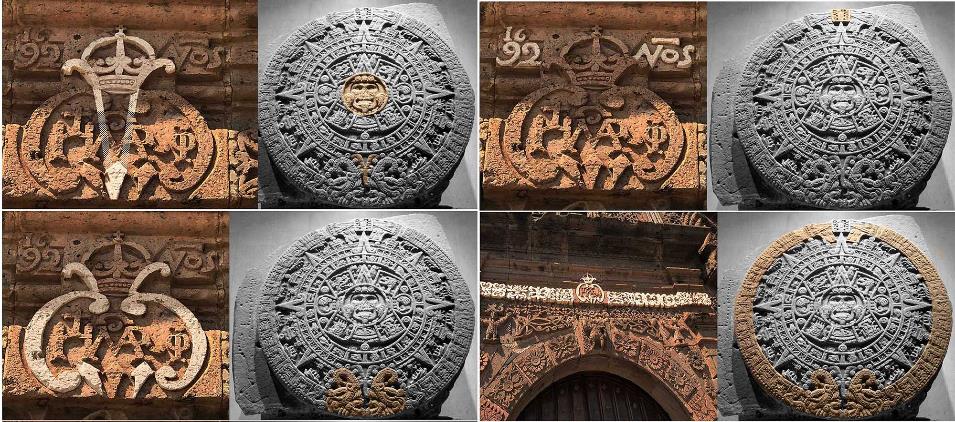 Un análisis comparativo entre esta y la capilla de indios, reconoce semejanzas significativas tanto en la forma como en el contenido. La representación del "cuatro movimientos" y el Quinto Sol están presentes en ambos contextos. En la capilla, la Corona Real simula la faz de Tonatiuh, donde los ojos y la nariz se representan ingeniosamente en el centro de la estructura, y la base de la corona evoca el collar de chalchihuites que adorna a esta deidad solar. Además, un rayo solar, visible en la piedra calendárica, se integra en las vírgulas laterales que sostienen la corona, extendiéndose hacia abajo. Las dos cabezas de serpiente que se observan en la Piedra del Sol se reinterpretan en la capilla como las vírgulas y volutas que apoyan la corona; incluso, el cuerpo de las serpientes se simboliza mediante las volutas excéntricas a lo largo del friso. Respecto a la fecha de 1692 que acompaña a la corona parece tener una función similar al signo “13 flor” tallado en la Piedra del Sol. Además, se destaca la omisión de la letra “A” en la inscripción de la capilla, la cual aparece invertida y sosteniendo la corona (figura 12).