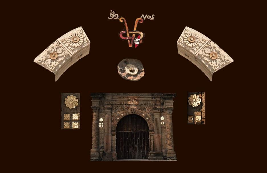 El símbolo del año en la cosmovisión mesoamericana se asemeja a la letra "A", combinado con cuatro signos específicos: pedernal al norte, casa al oeste, conejo al sur y caña al este, los cuales, junto con los números del 1 al 13, completan un ciclo de 52 años (Sahagún, 1999). La fecha 1692 parece evocar un acontecimiento significativo, como se refuerza en la representación de las flores situadas entre las pilastras estriadas y las columnas salomónicas (figura 13).