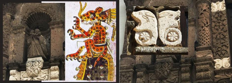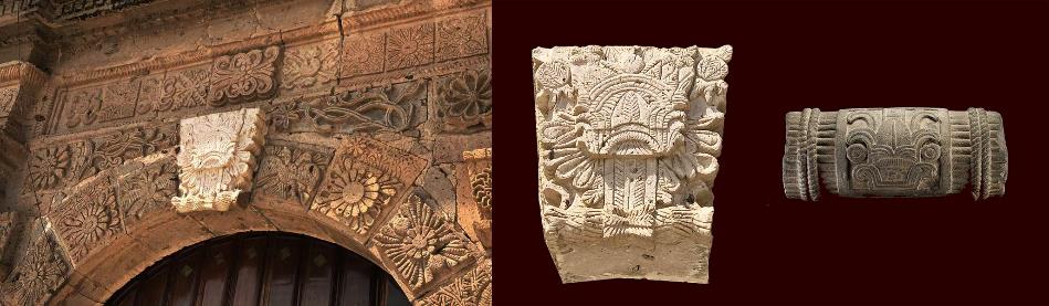 En la base de la portada, las volutas delinean el glifo “cerro”, extendiéndose hasta la cúspide. La estructura está rematada por una cruz tallada en piedra, simbolizando la Santa Cruz y posiblemente el rito de petición de lluvia.