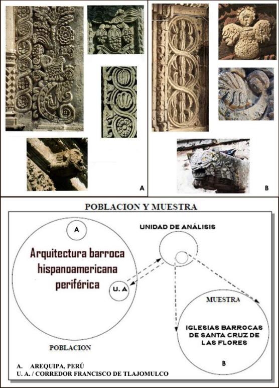 En el territorio de Tlajomulco, la arquitectura religiosa BHAP se agrupa bajo el nombre de “Corredor Franciscano de Tlajomulco” (CFT), que abarca desde mediados del siglo XVII hasta el siglo XVIII. Este corredor incluye diez parroquias y seis capillas en los municipios actuales de Tlajomulco de Zúñiga y Tlaquepaque, con localidades como Tlajomulco (cabecera municipal), San Agustín [Cocolpitan], Santa Anita [Atlixtac], San Sebastián el Grande [Tzapotepec], San Miguel Cuyutlán, Cuexcomatitlán, San Juan Evangelista [Xóchitlan], San Lucas Evangelista, Cajititlán y, especialmente, Santa Cruz de las Flores [Xóchitlan] como objeto principal de este estudio. Estas iglesias presentan portadas características de la arquitectura BHAP (figura2).