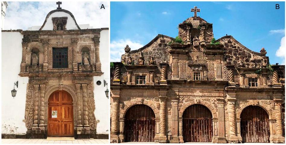 Elaboración propia, 2024.Estas estructuras conservan portadas originales que exhiben una rica decoración con motivos antropomorfos, zoomorfos y fitomorfos de tradición mesoamericana, destacadas en su exuberante estilo barroco. La capilla-hospital de indios, en particular, es reconocida por su portada en altorrelieve, considerada emblemática por su intensa decoración iconográfica (Alcántar, 2016; Alcántar, Thomas & Ruiz, 1987). La parroquia de Nuestra Señora de la Soledad, por su parte, se distingue por su decoración arquitectónica, clasificada dentro del barroco rico (Hernández, 2008; Alcántar, Thomas & Ruiz, 1987).