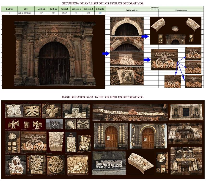Para identificar los patrones estilísticos en las portadas y exteriorizar las regularidades del modelo estilístico aplicado a las portadas de las iglesias BHAP en estudio, se clasifican y describen las propiedades simétricas, la posición y la orientación de las unidades básicas y mínimas que componen los elementos y motivos presentes en dichas portadas. Para ello, se recopila una base de datos fotográfica que recoge el corpus iconográfico de las iglesias en cuestión (Pérez, 2011; Castellón, 1998).