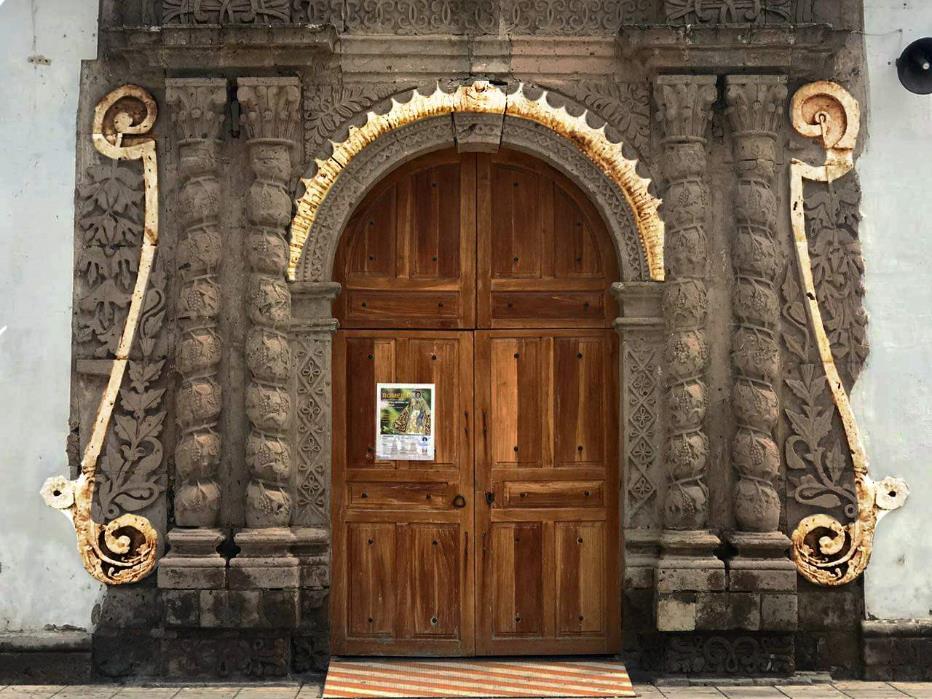 La portada de la parroquia está estructurada en dos cuerpos y un remate en forma de frontón circular con una cruz en la cúspide. El primer cuerpo alberga la puerta de entrada, adornada con diseños geométricos y orgánicos que evocan las fauces de una serpiente. Estos detalles, en relieve en la portada, presentan volutas y elementos vegetales que se arquean en la parte superior para simular ojos. El arco de medio punto se adorna con detalles triangulares que semejan los colmillos de la serpiente (figura 5).