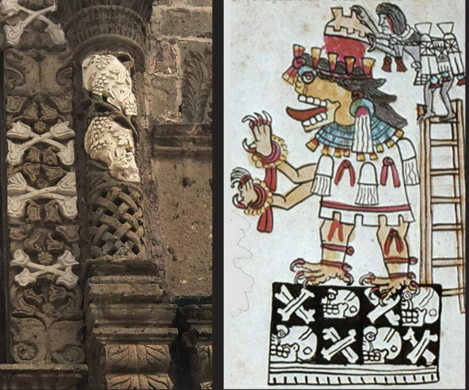 Las jambas de la ventana que se encuentra en el segundo cuerpo presentan en alto relieve la forma de "x" entrelazada con flores y tallos. Los códices Tudela y Magliabechiano ilustran a “Mictlantecuhtli” (Tudela,1980, lám. 76), el dios del inframundo, en un espacio decorado con huesos largos entrelazados y cráneos. En la parroquia, los tallos representan huesos largos y las flores las extremidades redondeadas. Además, las columnas tritóstilas exhiben agrupaciones de hojas y uvas que parecen dos cráneos en perfil mirando hacia afuera, con las uvas representando ingeniosamente los dientes y las ramas, hojas y uvas componen la mandíbula inferior y la forma del cráneo (figura 8).