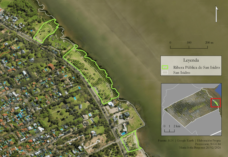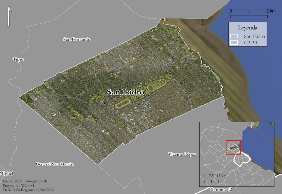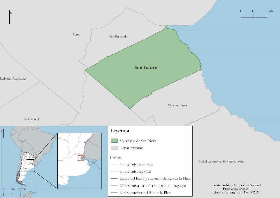 Desde hace casi dos décadas el municipio se ha posicionado como destino turístico (Araujo, 2022). Está ubicado en la Provincia de Buenos Aires, Argentina. Forma parte del AMBA (Área Metropolitana de Buenos Aires), ubicado a 27.9 km de CABA (Ciudad Autónoma de Buenos Aires). Limita con los municipios de Vicente López, San Fernando, Tigre y San Martín. Tiene la particularidad de tener acceso al Río de la Plata, por lo que cuenta con una extensa franja costera, de aproximadamente 6,53 km (figura 1). Por ello, el espacio público ribereño ofrece a los/as visitantes, a los/as turistas y a la propia comunidad de vecinos de San Isidro un número variado de actividades recreativas, deportivas y culturales que conjugan la propuesta municipal con la propia cotidianeidad de prácticas vecinales.