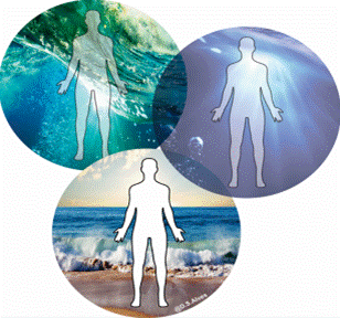 Para explicar melhor essa questão, podemos recorrer a um exemplo bastante comum, o caso da utilização das palavras “nascimento”, “crescimento” e “morte”. Isso é bem ilustrado na figura 6, a qual consiste na representação de um espectro nas dimensões de passado, presente, futuro. No primeiro círculo, o espectro está imerso em um oceano; no segundo, ele está na praia e no terceiro retorna ao oceano. Nos três casos, o elemento água condiciona a existência do ser. As intersecções que conectam os círculos significam que as três realidades estão interligadas em todas as fases da linha temporal, independentemente se o contexto se caracteriza mais com o passado, presente ou futuro.