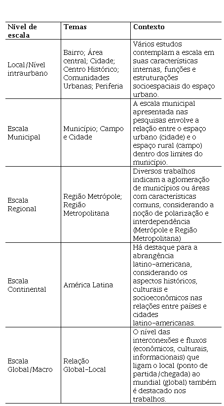Com relação à linha deescala, as pesquisas abordam diferentes níveis de análise do espaço geográfico, nos quais estão identificadas as relações internas da cidade, as configurações espaciais de bairros, áreas centrais, periferias e comunidades urbanas em escala intraurbana. Em outra dimensão espacial, identificamos estudos que abordam as relações entre cidade e campo, enquanto outros discutem o contexto municipal e metropolitano, chegando às interconexões globais. Destacam-se ainda pesquisas sobre metrópoles e regiões metropolitanas brasileiras e latino-americanas.