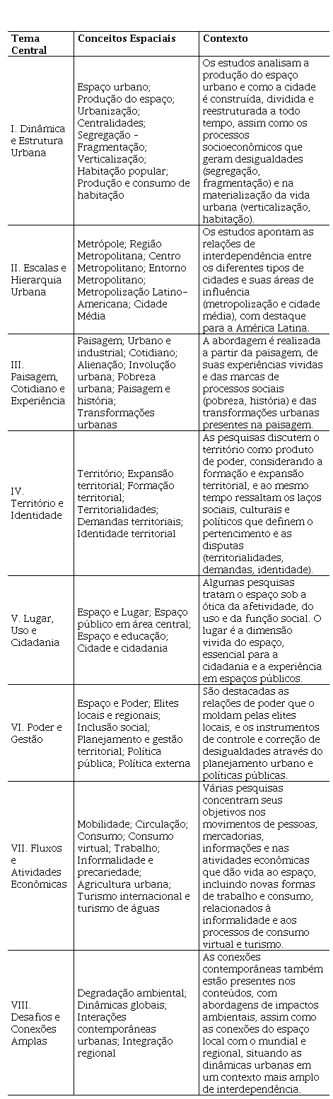 Na linha dos conceitos espaciais, encontram-se estudos com enfoque na dinâmica urbana, nos processos de urbanização e na hierarquia entre cidades, enfatizando desigualdades, especificidades regionais e o contexto latino-americano. Ressalta-se que os estudos abordam desde o parâmetro local e suas especificidades até as relações globais, em suas interconexões e fluxos, especialmente na Geografia Urbana, contemplando temas como as metrópoles brasileiras e latino-americanas, assim como a realidade distinta e multifacetada do interior do Brasil.