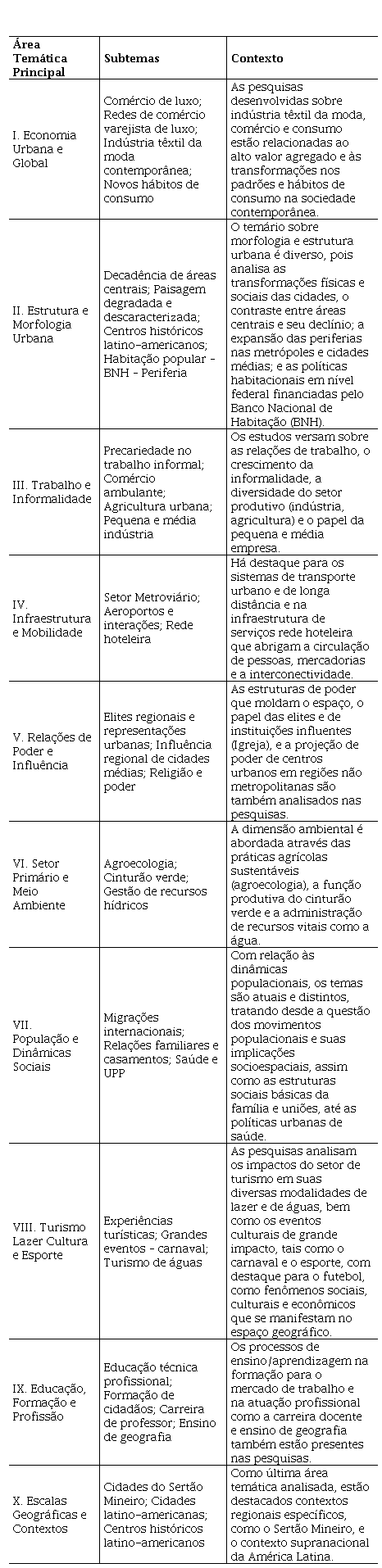 A organização temática da Linha de conteúdos abordados nas referidas pesquisas está apresentada em 10 tópicos, segundo área temática, subtemas e contexto. Neste conjunto, identificamos pluralidade de temas trabalhados, com contextos históricos diversificados, mas que caracterizam a sociedade contemporânea em seus múltiplos olhares e visões de mundo, evidenciando a complexidade e a integração das diferentes áreas envolvidas na organização do espaço.