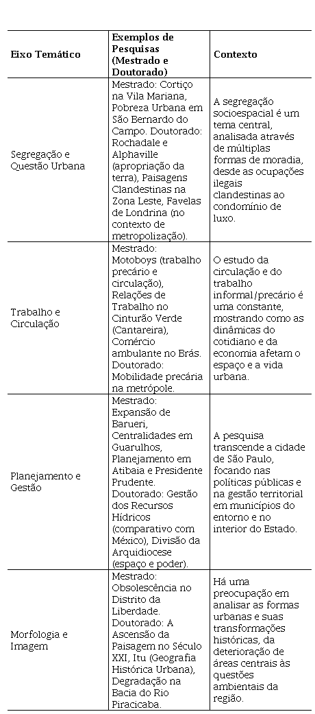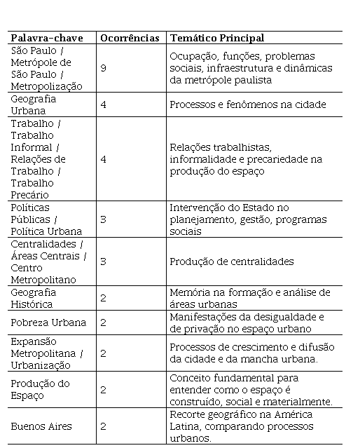 O conjunto das palavras-chave, assim como os títulos das dissertações e teses, confirmam a importância da Geografia Urbana, Econômica e Política, com ênfase nas relações de poder, consumo e desigualdade que atuam na produção do espaço metropolitano e regional, evidenciando temas de Geografia Urbana, para a questões de planejamento, política urbana, centralidades e desigualdade social, especialmente. Os dados e informações demostram que o espaço metropolitano de São Paulo e seus problemas notadamente sobre trabalho e informalidade é o principal objeto empírico dos estudos .