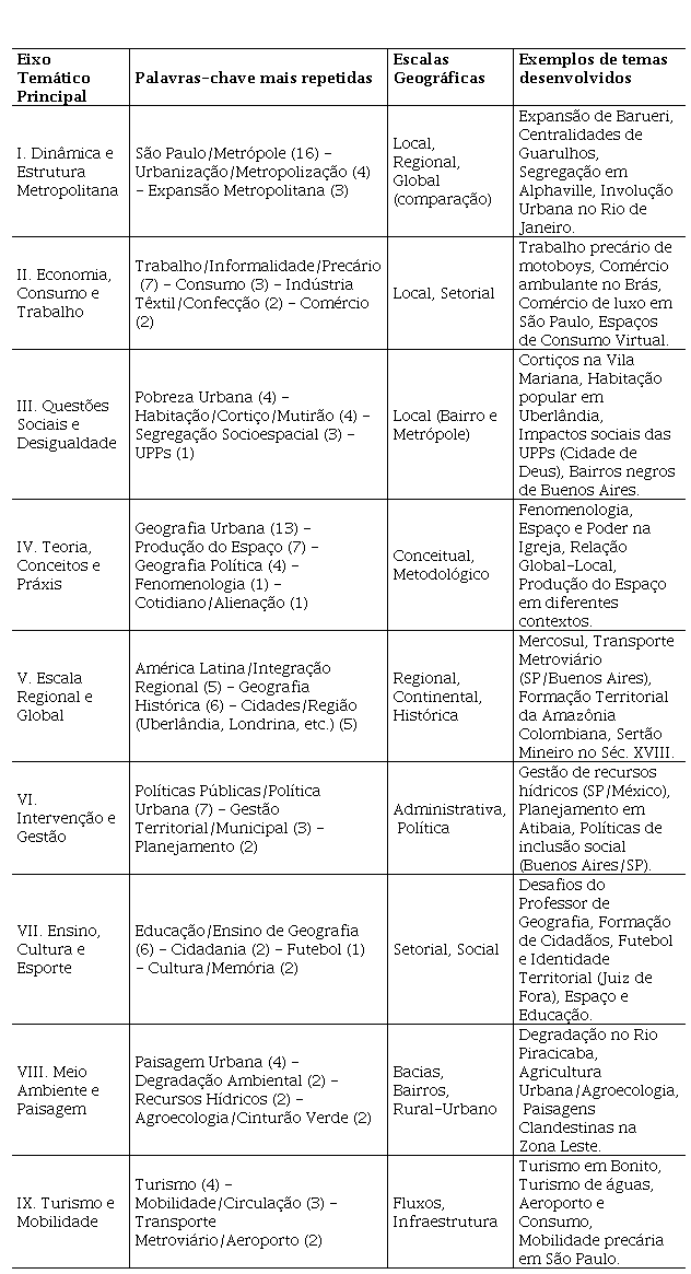 3. Eixo de Abordagem Temática: Governança, História e Fluxos – há ênfase na produção do espaço (Geografia Histórica) e em sua gestão (Gestão/Política). A questão da mobilidade/circulação aparece como um problema social e espacial importante, seja no contexto do transporte metroviário ou do trabalho precário de motoboys.