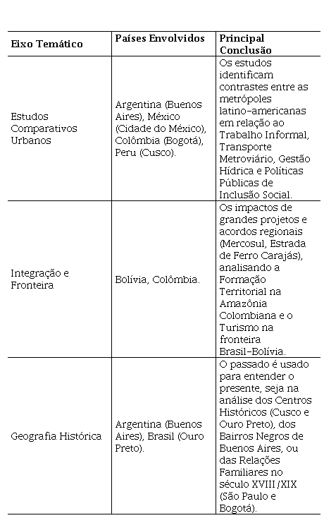4. Eixo Comparativo/Regional: América Latina – a inclusão de metrópoles como Buenos Aires e Bogotá sugere os diálogos e comparações regionais sobre o desenvolvimento e os problemas das grandes cidades sul-americanas.