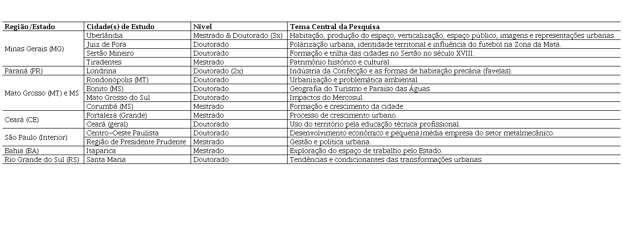 Os interesses desses alunos apontavam para o entendimento das estruturas urbanas, morfologia de cidades em um contexto local e regional; a compreensão da relação entre espaço, sociedade e poder; questões de gestão, desigualdades, políticas públicas, fluxos econômicos e mobilidade, além dos desafios ambientais e das conexões globais cujos resultados estão indicados em suas dissertações de mestrado e teses de doutorado desenvolvidas e defendidas nos programas citados.