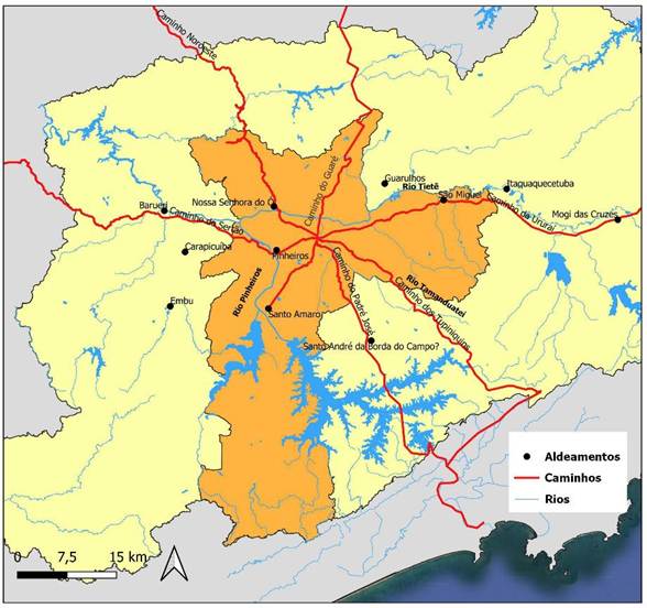 Em 1549, a Coroa portuguesa nomeou Tomé de Souza governador-geral da colônia, enviando-o com os primeiros jesuítas, liderados por Manoel de Nóbrega, para a catequização indígena. O percurso até o planalto paulistano exigia a travessia da Serra do Mar, um trajeto documentado por José de Anchieta em carta de 1554, na qual descreveu trechos íngremes da subida (Anchieta, 1933). A rota, que partia de São Vicente e atravessava o vale dos rios Mogi e Paranapiacaba, região de menor altitude na serra, durava cerca de três dias, com um deles dedicado exclusivamente à subida (Vilardaga, 2020). O estabelecimento da aldeia de Piratininga pelos jesuítas, em 1553, foi viabilizado pelo conhecimento ancestral dos caminhos indígenas, fundamentais para conectar o litoral ao interior. No ano seguinte, a construção do colégio jesuíta consolidou a fundação de São Paulo de Piratininga na lógica colonial.