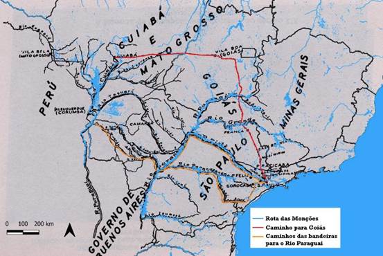 O declínio das bandeiras ocorreu no início do século XVIII, com a Guerra dos Emboabas e a consequente expulsão dos paulistas das Minas Gerais. Contudo, novas descobertas de ouro em Cuiabá e Goiás impulsionaram as monções, expedições fluviais que expandiram o território colonial. Diferentemente das bandeiras, as monções utilizavam os rios como vias de transporte, empregando grandes canoas indígenas capazes de carregar até quatro toneladas de carga (Holanda, 1975, 1990). Essas expedições, realizadas entre maio e julho, duravam de cinco a seis meses e integravam territórios remotos à economia colonial até a última monção, registrada em 1838 (figura 3).
