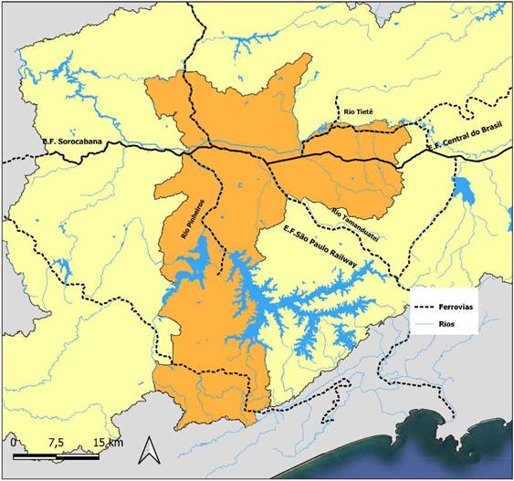 A solução veio em 1867, com a inauguração da São Paulo Railway (SPR), a primeira ferrovia paulista, marcando uma transformação na circulação regional. Essa ferrovia paulista gerou uma crise no tropeirismo, substituindo práticas tradicionais como aquelas do Largo dos Piques, em São Paulo, ponto de parada dos tropeiros vindos da feira de muares de Sorocaba. Para Prado Júnior (1998), as estradas de ferro replicavam, com pequenas alterações, antigos caminhos ancestrais, aproveitando o conhecimento acumulado pelos indígenas. A SPR seguiu o vale do rio Mogi até Paranapiacaba, passando pelas nascentes do Tamanduateí, justamente sobre antigas trilhas dos tupiniquins. Nesse mesmo sentido, além da SPR, destacaram-se a Estrada de Ferro Sorocabana (1875) e a Estrada de Ferro do Norte (1877), que se tornou a Estrada de Ferro Central do Brasil, em 1889 (figura 4).